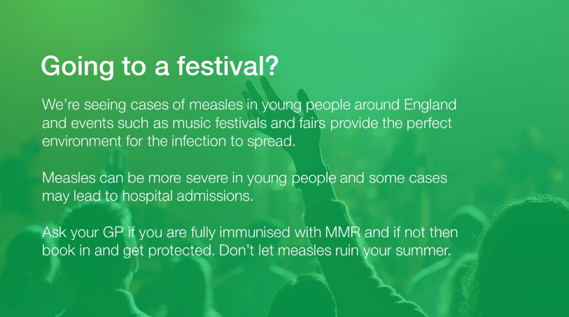 The good news is that measles can be prevented by having the MMR vaccine - and we need your help to spread this message. We have developed a toolkit (attached) which includes materials you can use in your communications with festival attendees to urge them to check their vaccination status.